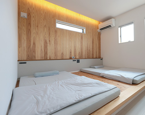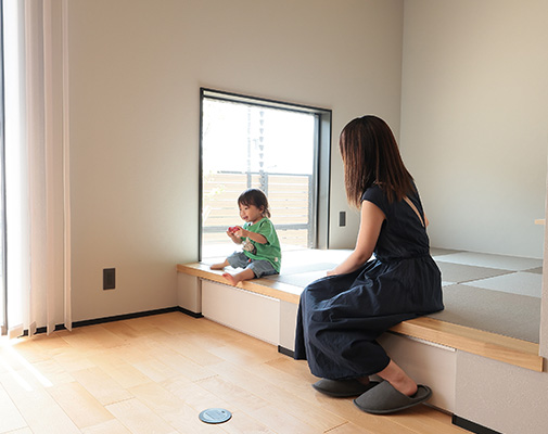 玄関横に設けた収納を兼ねたベンチは、当初は足の悪いゲスト用にと考えられていましたが、ご家族にとっても使い勝手が良いそう。「買い物帰りに一時的に荷物を置いたり、子どもを座らせて靴を履かせたり。自分たちも靴の脱ぎ履きがラクになりました」と奥様もお喜びのご様子です。