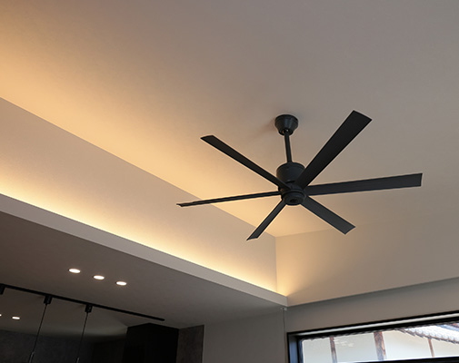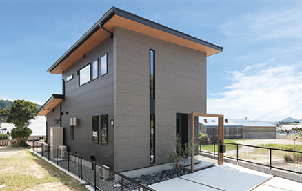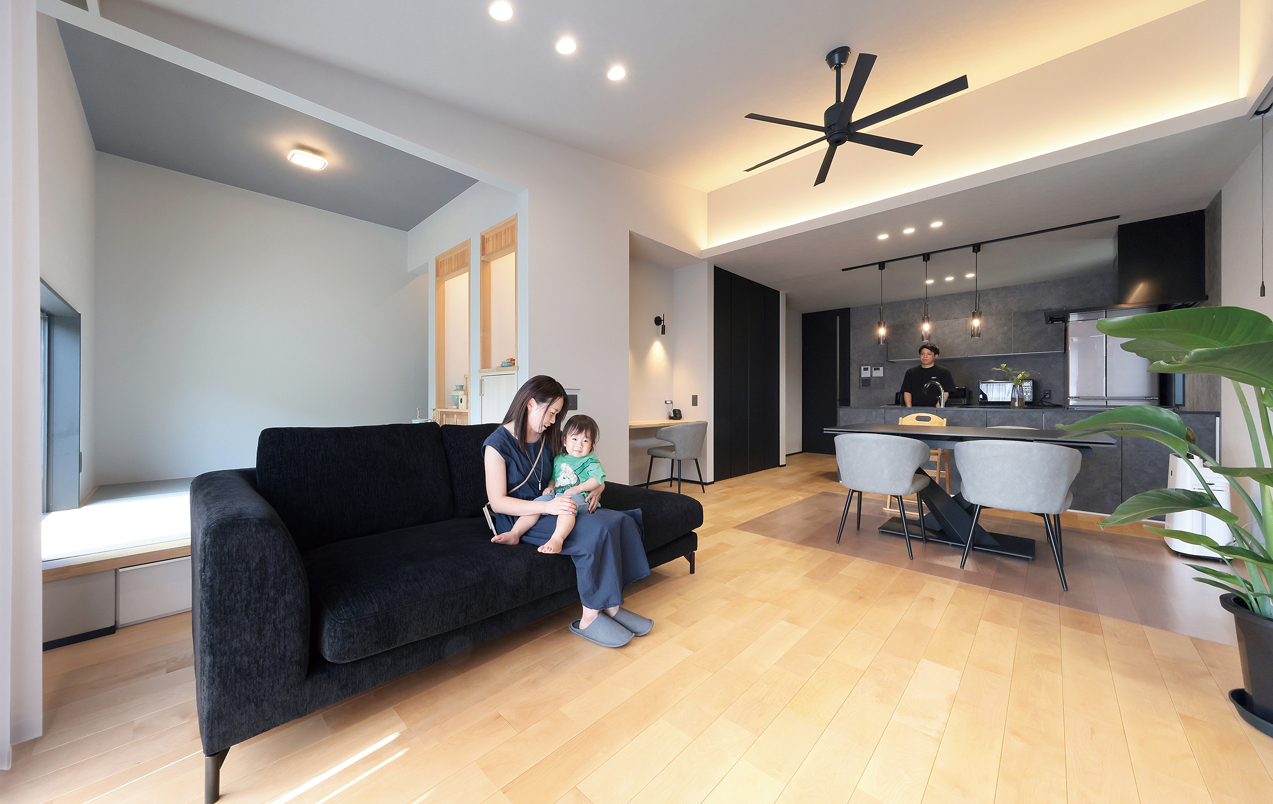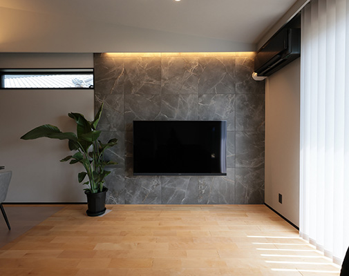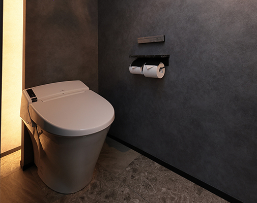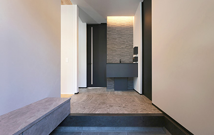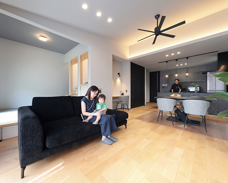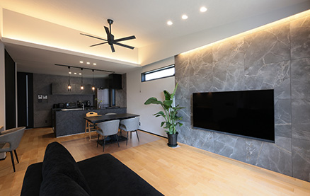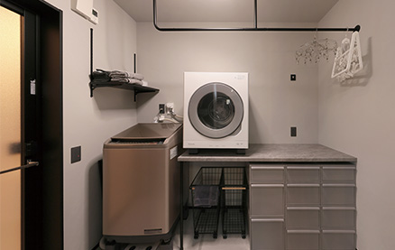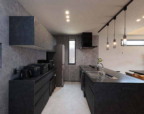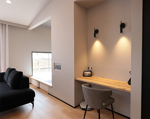 O様には、いずれ自宅でサロンを開きたいとの夢があり、家づくりではサロン経営を見据えたプランの工夫も盛り込まれました。LDKなどご家族の生活動線を通ることなくゲストを迎えられるよう玄関横にサロン用の洋室を配置し、洋室近くに洗面・トイレを配置。玄関正面に配置した洗面台にはマットブラックのスタイリッシュなタイプを選ばれ、上質感あふれる空間を演出。トイレには陰影が美しいペンダントライトや間接照明を採用され、おしゃれなバーのような雰囲気に仕上げられました。